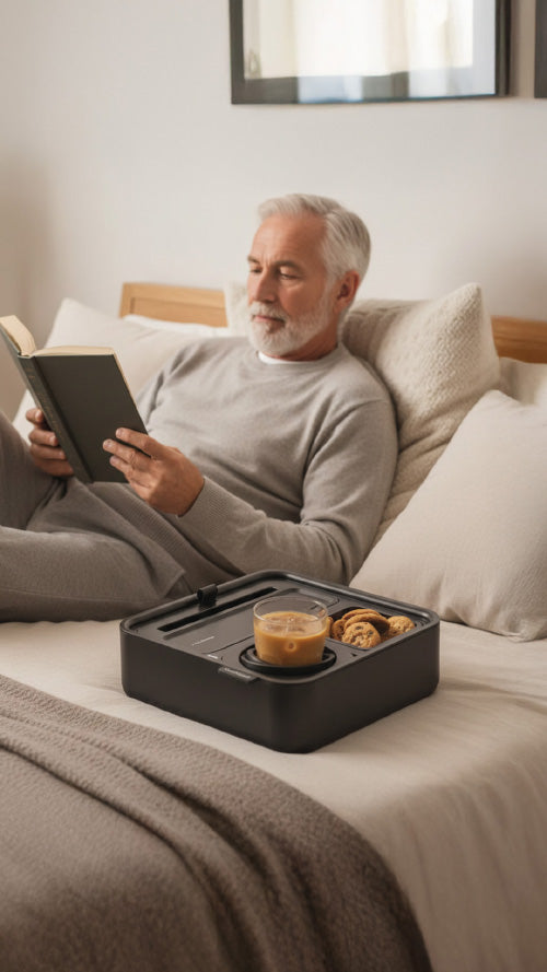 The multi-use tray keeps remotes, phones, glasses, or earbuds in one neat spot — or flip it into a comfy armrest when lounging in bed.